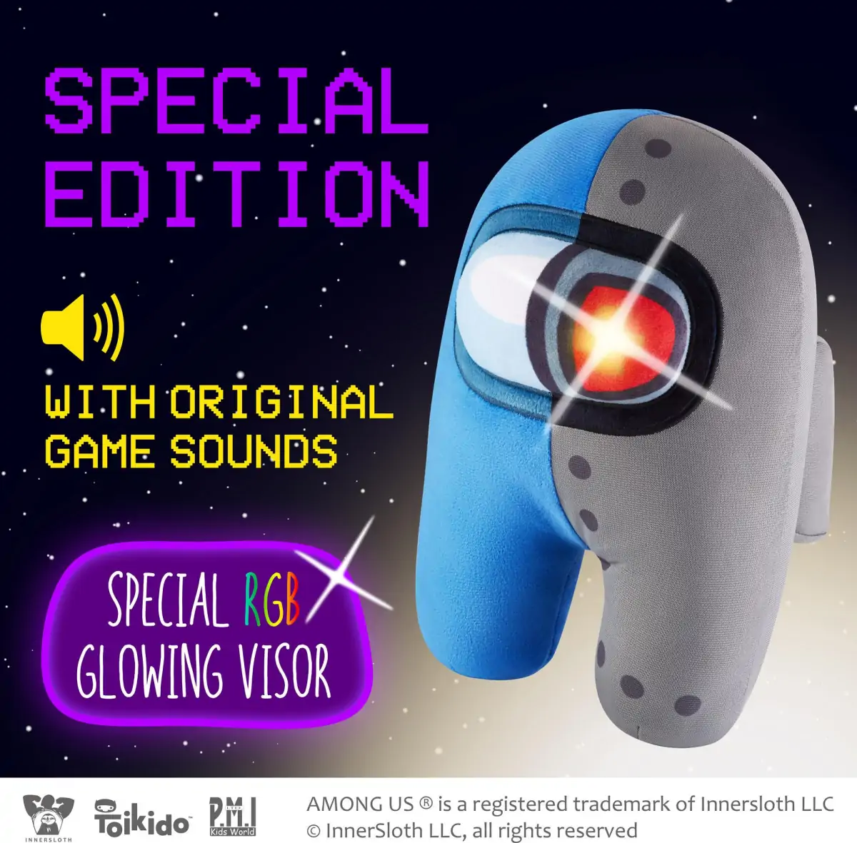 Denne Special Edition 25cm høje Among Us bamse har et ekstra sejt blå/grå design og lysende visir. Bamsen inkluderer derudover originale lydeffekter fra Among Us-spillet som enhver der har spillet spillet vil genkende!