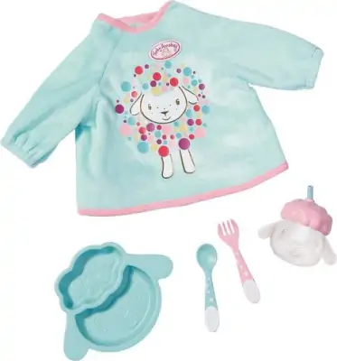 Baby Annabell glæder sig altid til frokost, når hendes lammeformede tallerken bliver placeret på bordet foran hende. Hun vil gerne holde sin blå ske og lyserøde gaffel med søde hvide stjerner på, og spise selv. Det kan godt blive noget griseri. Heldigvis har Baby Annabells bluse en indbygget hagesmæk. Man lægger næsten ikke mærke til den spildte mad blandt alle de sjove polkaprikker på blusen. Den lille dukke er allerede god til at holde sin flaske i håndtaget og drikke med sugerør.