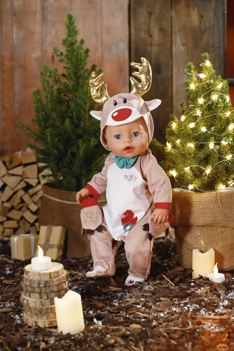 Gør julen ekstra hyggelig og klæd din yndlingsdukke ud som Rudolf i denne super søde heldragt! Heldragten er udstyret med et guld gevir, små rensdyr-ører og en lille stump hale. Handskerne er fastgjort til heldragten i én side, så man selv kan vælge, om de skal være på eller blot skal hænge.