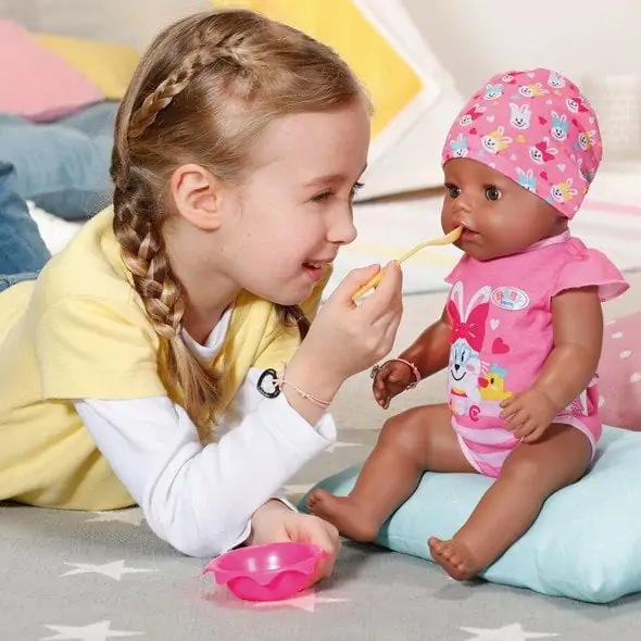 Børn kan vække BABYborn og lægge hende til at sove. Hun kan også drikke vand, græde tårer, væde sin ble, spise mad og gå i bad.