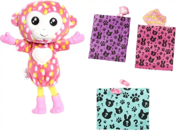 Få den sødeste udpakningsoplevelse og oplev de syv overraskelser. Mød en sød babyabe og fjern derefter plysdragten for at afsløre en Chelsea™-dukke! Hver dukke kommer med glimtende motiver i ansigtet, som får dem til at se ekstra søde ud. Udforsk de andre overraskelser som fx en nederdel og et minidyr, som passer til dukkens kostume.