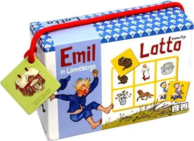 Den søde æske kan nemt tages med rundt ved at bære den i den røde hank. Det klassiske billedlotteri består af farverige brikker, der er dekoreret med motiver fra Emil fra Lønneberg. Spil sammen med familie og venner og se, hvem der først kan få sin plade fuld af brikker!