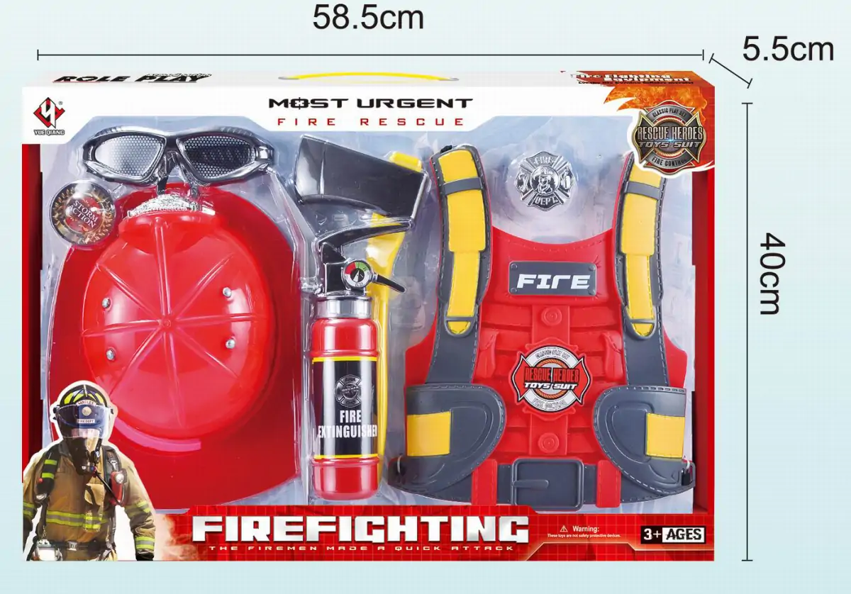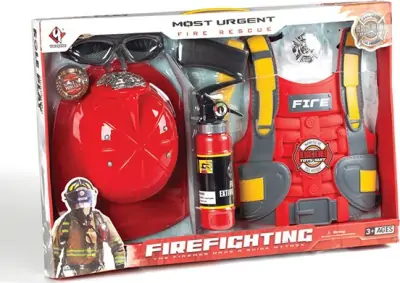 Dette brandmandssæt sæt indeholder både brandmandshjelm, briller, brækjern, økse, skumslukker, skilt og en brandmandsvest.