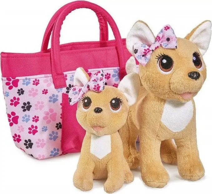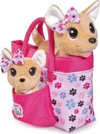 De sødeste små hunde – en hundemor med sin lille hundehvalp. De har deres helt egen bæretaske, så du kan tage dem med dig over alt. De små chihuahuaer er begge dejligt bløde og har fine, matchende sløjfer ved det ene øre. Deres bæretaske er lyserød med fint potetryk på.