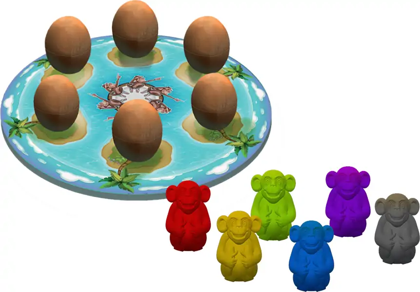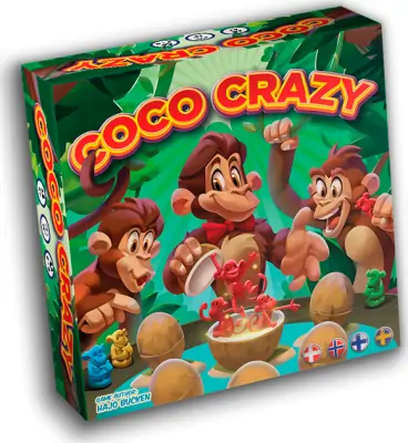 Coco Crazy er et spil, der kan spilles af familiemedlemmer i alle aldre, og det er nu vendt tilbage fra de glade 90’ere. Du ved, hvad du skal gøre ud fra terningerne, når det er din tur, hvor du skal vende brættet eller forsøge at finde en abe, du mangler. Når du har set hvilke aber, der gemmer sig i hvilken kokosnød, skal du huske det.