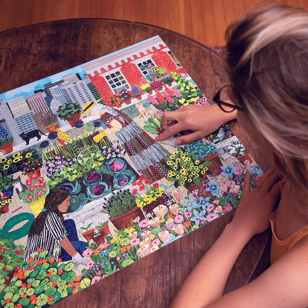 Puslespillet “Urban Gardening” består af 1000 brikker, og tilsammen forestiller de et frodigt og grønt paradis af bær, grøntsager, planter og blomster på en tagterrasse i storbyen.