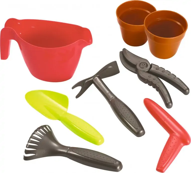 I trollyen er der en rive, spatel, hakke, beskæringssaks, vandkande, 2 potter og meget mere.