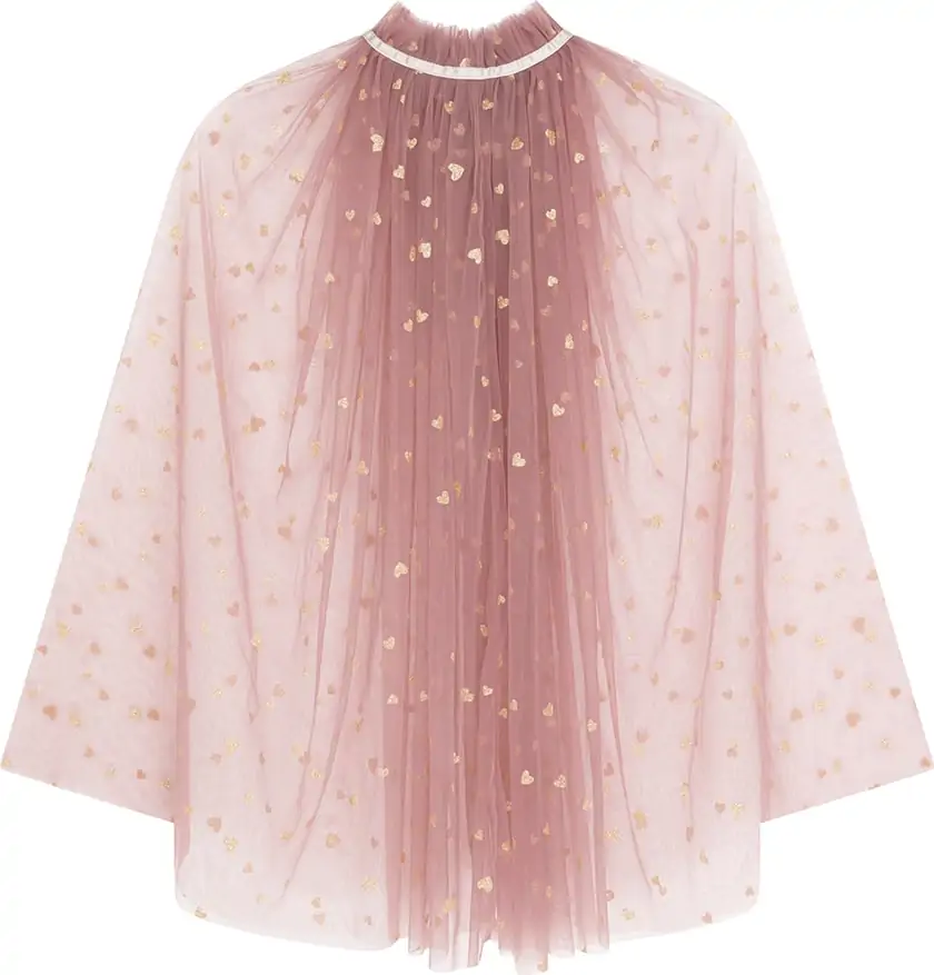 Pink-rosa kappe i tyl med hjertedekorationer. Kappen er forsynet med bindebånd i satin med hjertevedhæng.