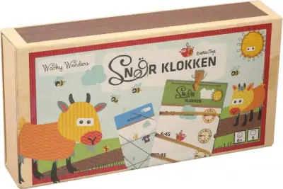 Spillet Snør Klokken hjælper barnet med at lære forskellen på viserne og de forskellige tidspunkter på dagen. Æsken indeholder 5 Snørekort, hvor der med en snor skal snøres mellem de to tider på kortene, der passer sammen.