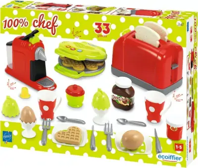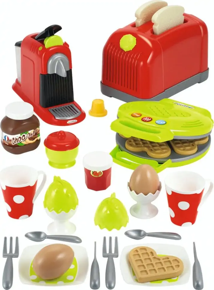 Med dette sæt får du 33 dele, som bl.a. består af service til to personer (bestik, tallerken, æggebægre og krus), æg, vaffeljern med vafler, brødrister med toast, en kaffemaskine med kapsler og meget andet.