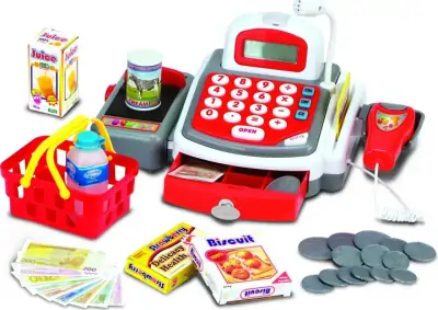 Moderne kasseapparat med alt hvad du behøver, for at blive en dygtig kassedame. Dette kasseapparat har både lyd, lys og en indbygget lommeregner, og den gør derfor legen meget mere virkelighedstro for de små.