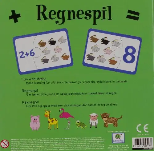 Hvert puslespil består af 2 brikker (i alt 18 brikker). Hvor mange dyr er der på billedet? På bagsiden står der et regnestykke, der passer til billedet. Der er 9 forskellige puslespil, der kan samles.