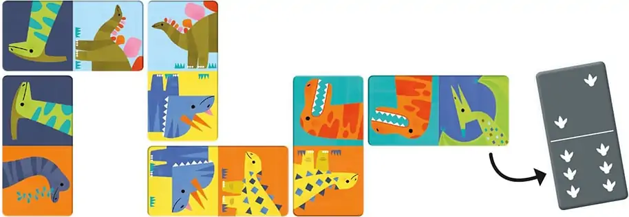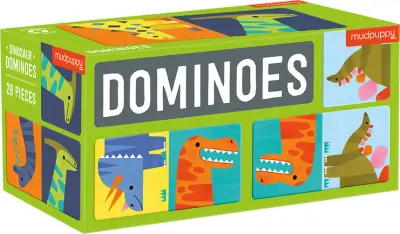 Dinosaur Dominoes fra Mudpuppy inkluderer 28 overdimensionerede dobbeltsidede dominobrikker med illustrerede dinosaurer på den ene side og nummererede fodspor på den modsatte side – to måder at spille på!