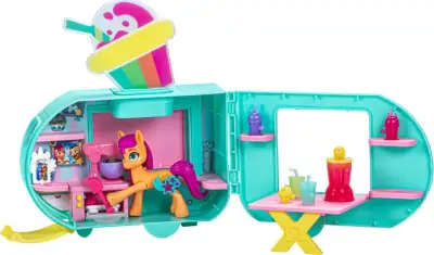 Dette legesæt kommer med en ponyfigur, som kan poseres på forskellige måder, og en smoothietruck, som åbner sig op til et legekøkken med legetøjsmad. Lav søde cupcakes i ovnen eller forfriskende smoothies i blenderen. Tryk Sunnys hov mod truckens stang for at tænde for neonlyset og åbne vinduet. Sættet inkluderer 15 forskellige slags tilbehør.