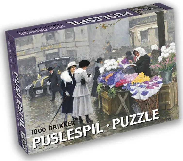 Når puslespillet er lagt, forestiller det et blomstermarked i en ældre by. Motivet er super fint, og det er designet i flotte farver.