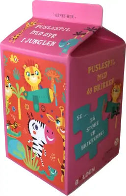 Dette sjove puslespil leveres i en sjov mælkekarton, der nok skal sætte nysgerrigheden i gang. Der er i alt 48 brikker i puslespillet, og de er udført i kraftig, holdbar kvalitet. Derudover medfølger der en stofpose til brikkerne.