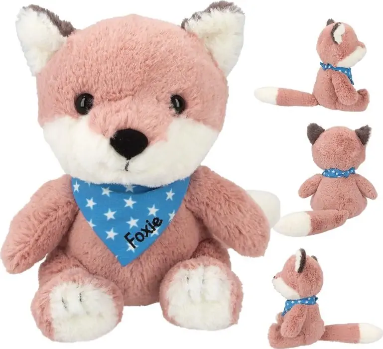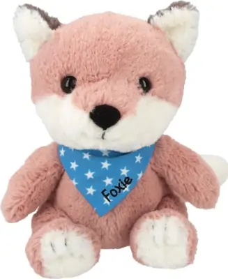 Snukis plysræven, Foxie, er lavet i det blødeste og mest krammevenlige materiale, og så passer han perfekt i et par børnearme, som har brug for lidt ekstra tryghed ved sovetid. Foxie har en lyserød pels og et blåt halstørklæde, hvorpå navnet er broderet.