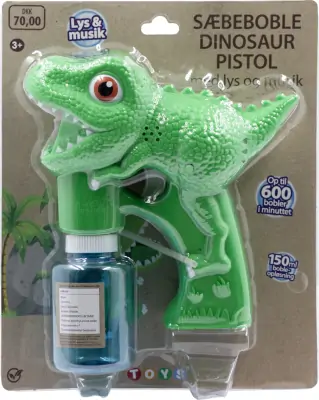 Sæbeboblepistol til ubegrænset sjov, i sejt Dino-design. Ud over sæbeboblefunktionen har den også lys og musik. Sættet indeholder også det perfekte sæbevand, så det sjove kan begynde så snart du modtager sættet.