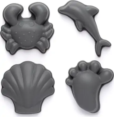 Formene er mørkegrå og er lavet i strandmotiver som en muslingeskal, delfin, fodprint og en krabbe.