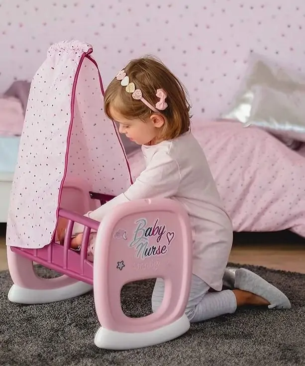 Her får du en sød vugge med sengehimmel fra Smoby.