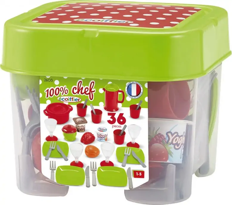 Dette sæt består af hele 36 dele. Sættet indeholder service til fire personer, frugt, yoghurt, en gryde og en kande.