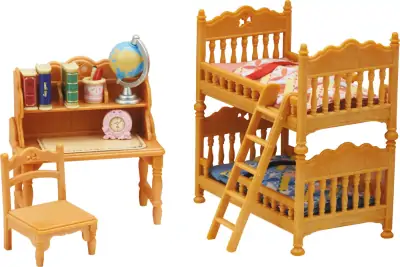 Super sødt lille møbelsæt fra Sylvanian Families i landlig stil. Sættet indeholder 18 dele bestående af sengetæpper, to senge der kan laves om til køjeseng, skrivebord, stol samt små, skønne skrivebordsartikler, heriblandt globus, bøger, ur mv.
