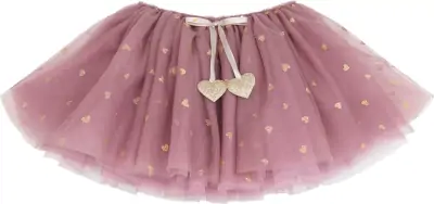 Pink-rosa tylskørt med hjertedekoration. Skørtet er forsynet med bindebånd i satin med hjertevedhæng.