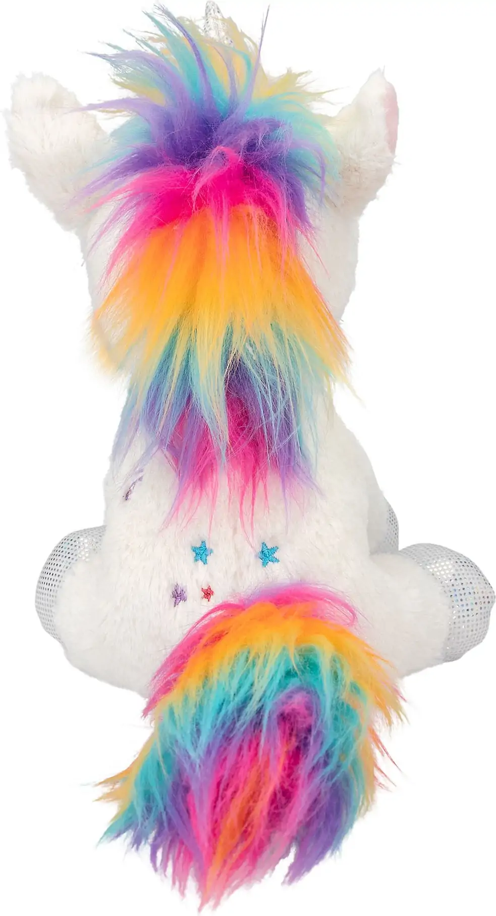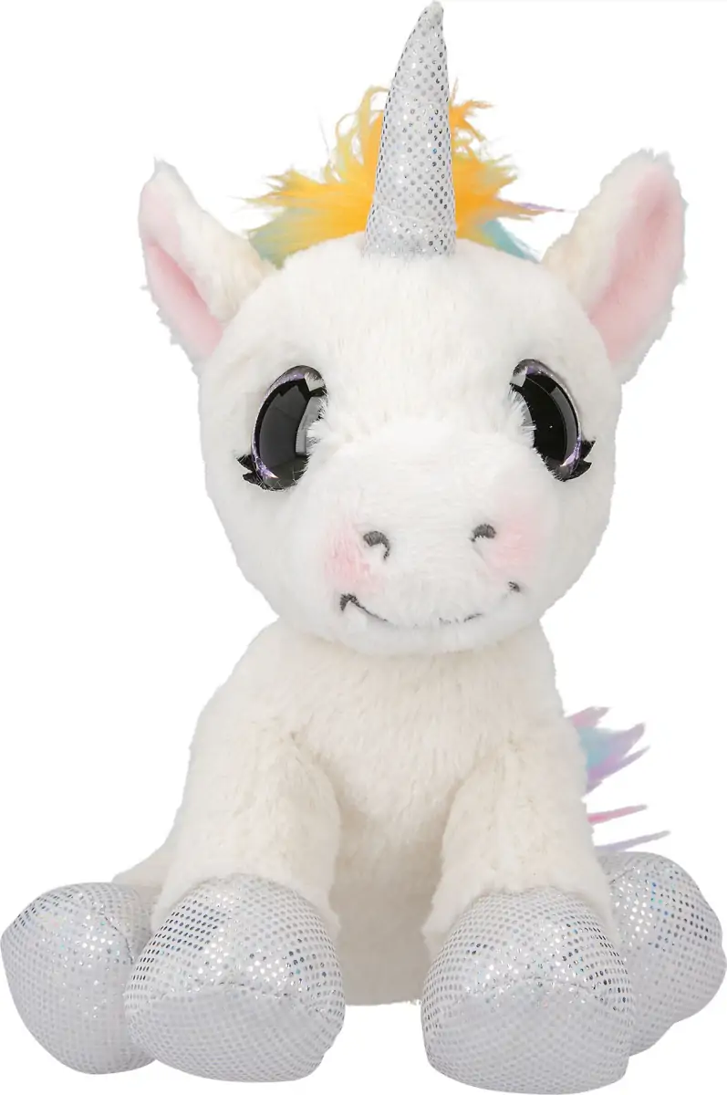 Eventyrs krammebamse – Den hvide plys enhjørning Naya har en farverig regnbuemanke, lilla glitterøjne og glitterhove og hornet i sølv.