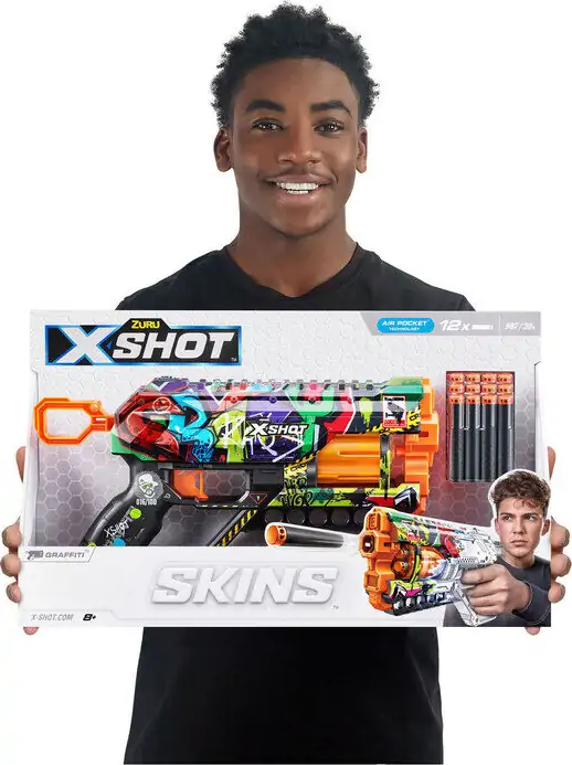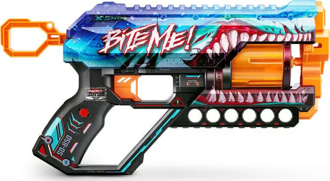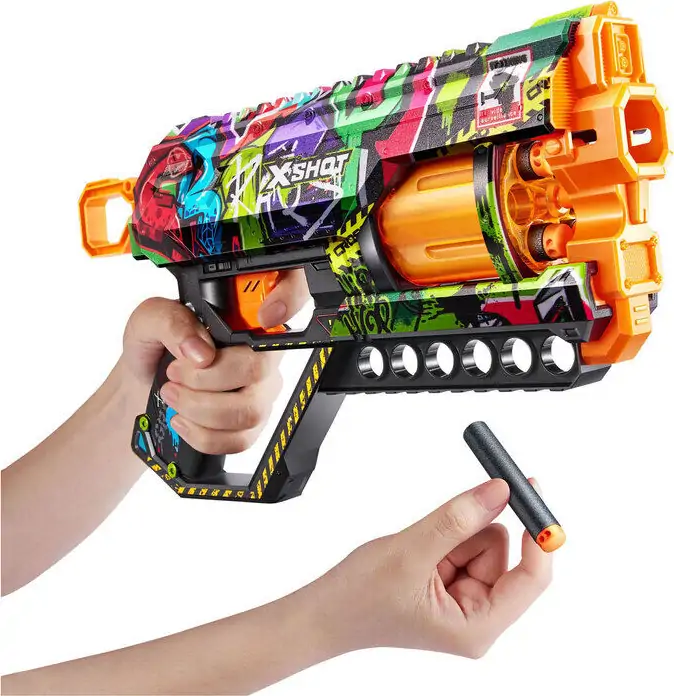 X-Shot-skins bringer spiloplevelsen ind i den virkelige verden. Vælg din blaster, og gå i kamp. X-Shot Skins Griefer har nok kraft til at ramme mål på 27 meters afstand! Denne blaster lader konkurrenterne forblive langt væk med en hurtig affyring af 6 pile på mindre end 30 sekunder og med dens roterende magasin. X-Shot Skins Griefer Blaster leveres i 6 unikke skins til at samle og leveres med 12 Air Pocket Technology skumdartpile. Vælg anderledes, vælg X-Shot Skins.